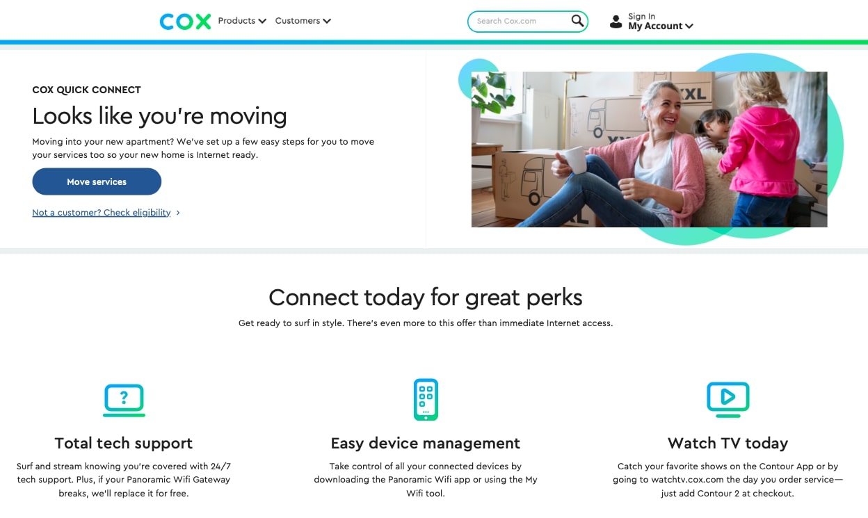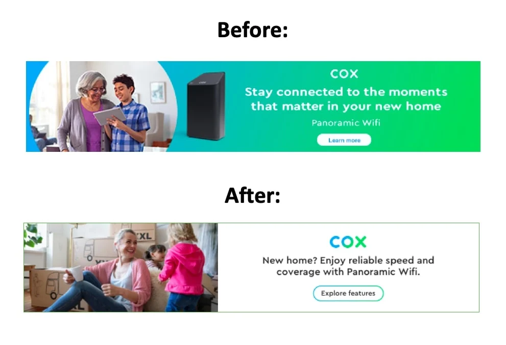 I rewrote empathetic copy (below), by directly addressing the customer ("Looks like you're moving") with a clear CTA ("Move services"), and a reminder of benefits they can expect while using Cox's services. I also collaborated with my team's UX designer to select an accompanying photo of a smiling family with packed boxes (below, right) to further lighten the mood.