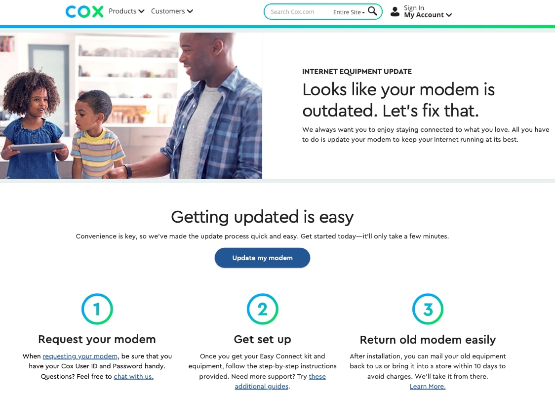 With a clear CTA ("Update my modem") and helpful in-text links, customers are more likely to find Cox reliable and strengthens the customer-brand relationship.
