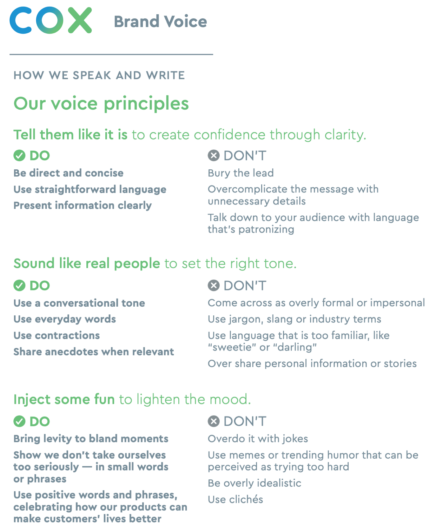 Originally Cox's website content had long copy and did not feel approachable, by only showing the products and not images of people interacting with them. As this strayed from the brand's voice (above), I collaborated with my team's UX designers to recommend strategies to improve our client's website and messaging delivery.
