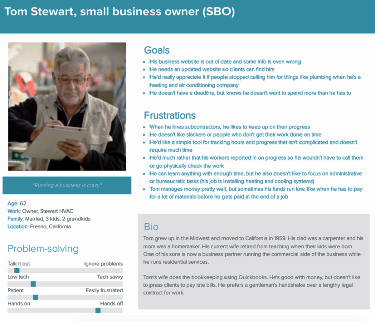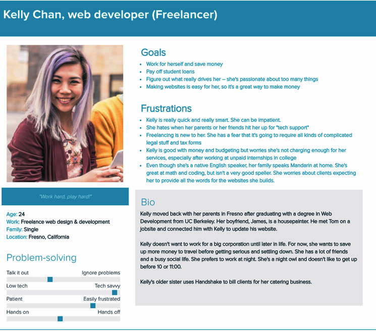 I was given two user personas (below). One is a young adult woman who does freelance web design; the other is a male business owner in his early 60s who is not confident with technology.