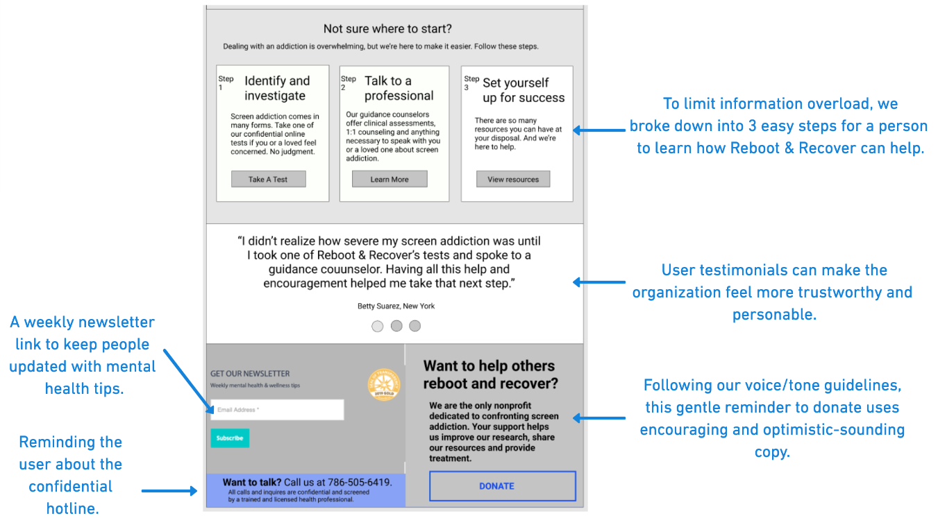 To conduct UX research, a teammate and I interviewed Reboot & Recover’s founder and 3 licensed health professionals to learn more about screen addiction and their pain points with the website thus far.
