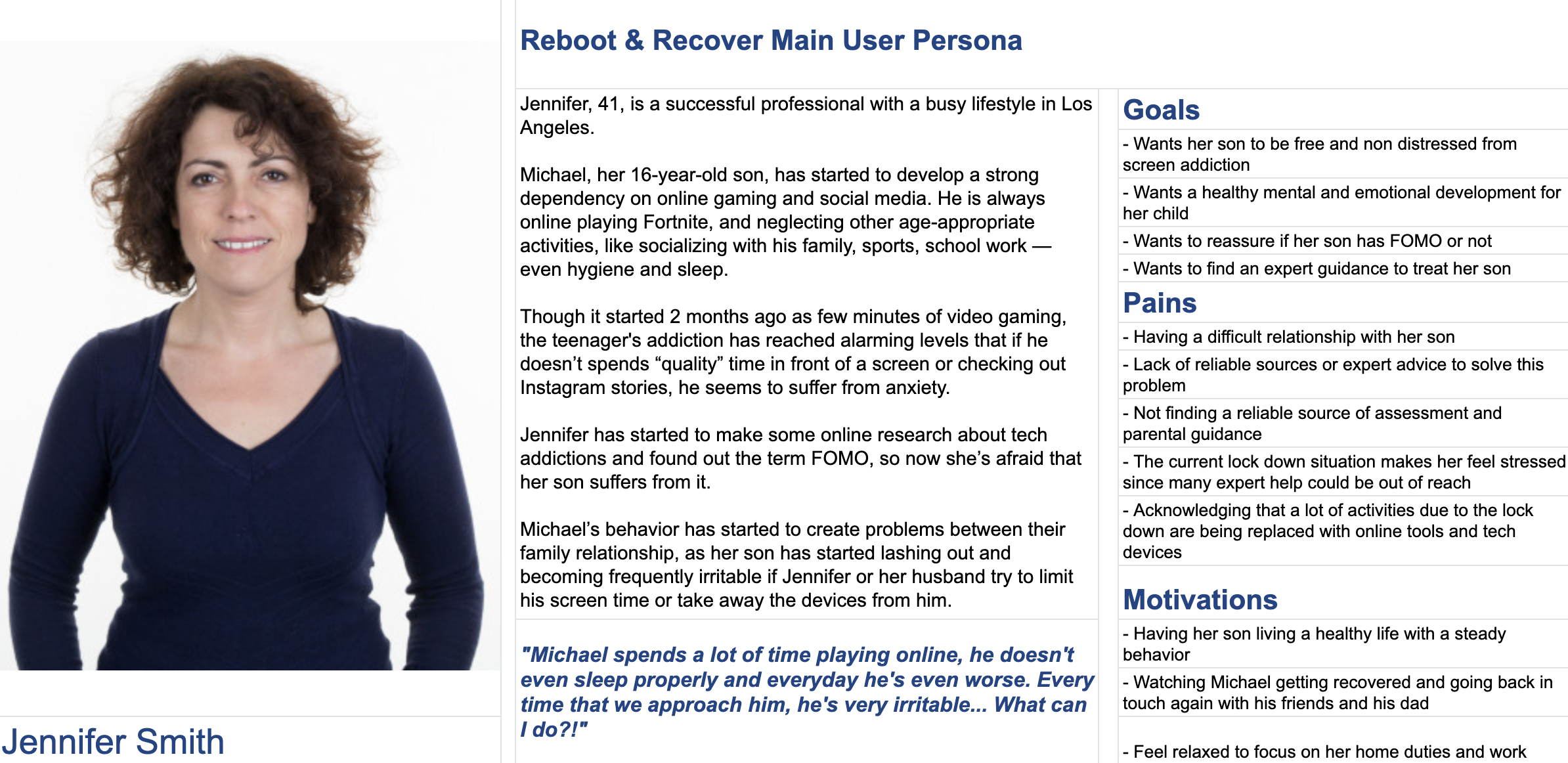 Our UX research helped my teammate develop 2 new user personas. The main user persona (below) focuses on a concerned middle-aged mother of a son who's struggling with screen addiction.