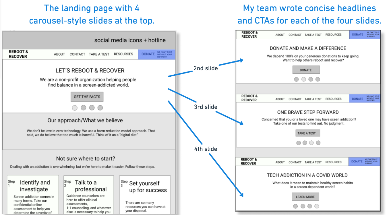 Applying a carousel design above the fold allowed my team to organize and show multiple headlines, resources and CTAs to a reader. We created Figma wireframes for the new landing page and presented to our client: