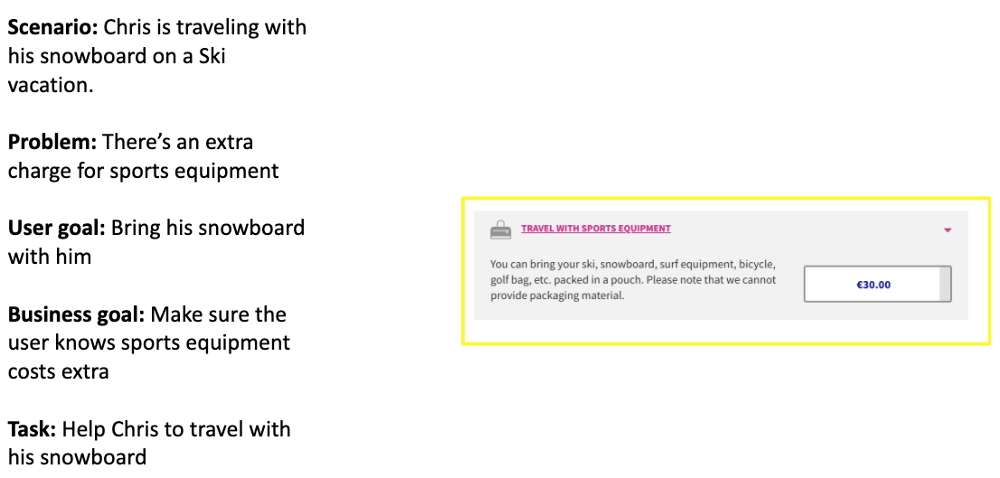 The paragraph concisely informs the customer what to expect when flying with sports gear. I also included an additional tooltip that informs the customer what types of baggage sizes and weight are allowed.