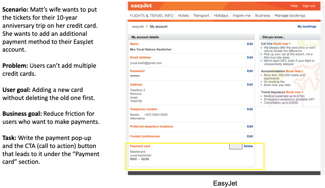 However, the easyJet site only allows one payment card (highlighted in a yellow rectangle, below) which may discourage the customer from booking the flight with easyJet.