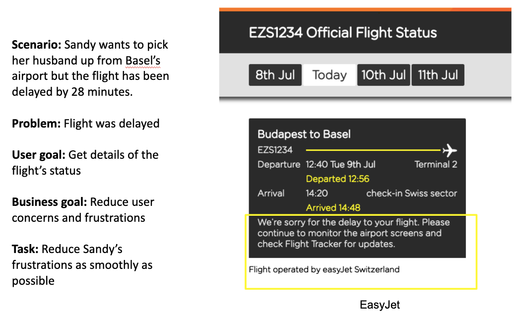 However, the person is not informed about what caused the delay and does not give the person any options on how to move forward (like possibly requesting live flight updates or calling customer support).