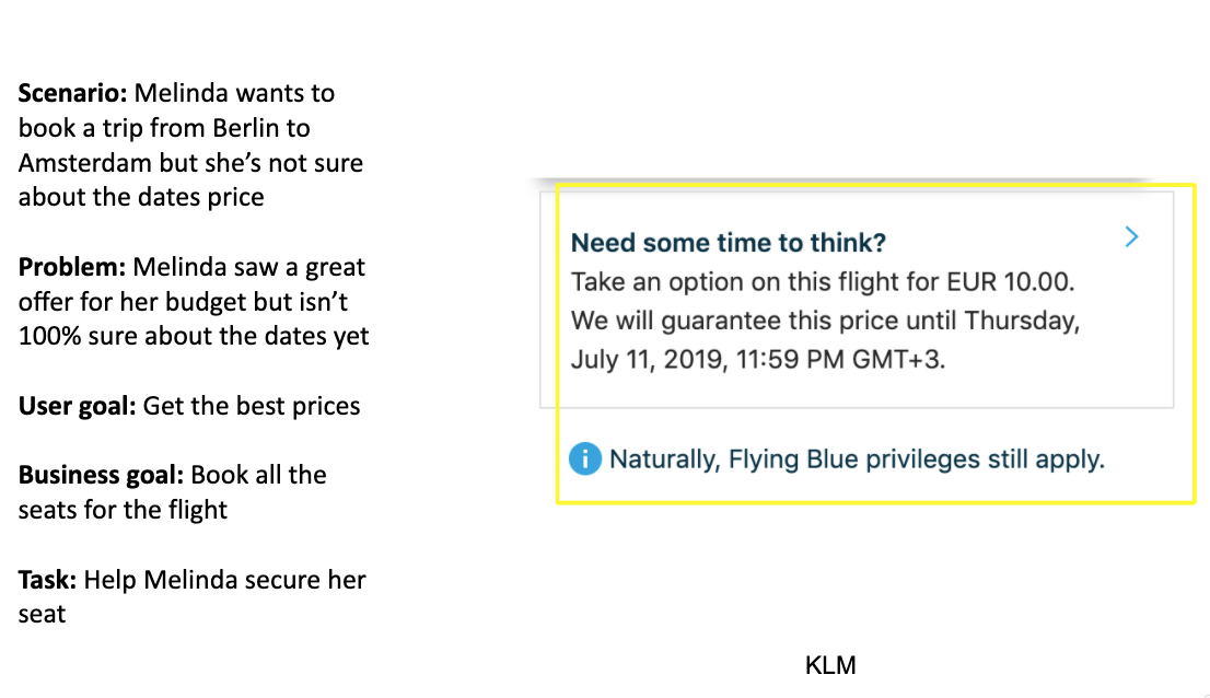 The copy in the yellow rectangle (below, right) gives her an option to keep that offer’s price for now until a later time when she can decide the final dates. However, the copy looks a bit confusing and lengthy, which may cause added unnecessary stress of the customer.