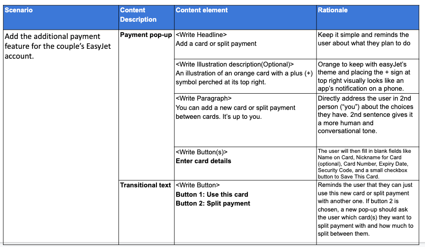 With this copy deck above, I detailed how a payment pop-up’s copy could be written, with a pop-up headline saying, “Add a card or split payment”.